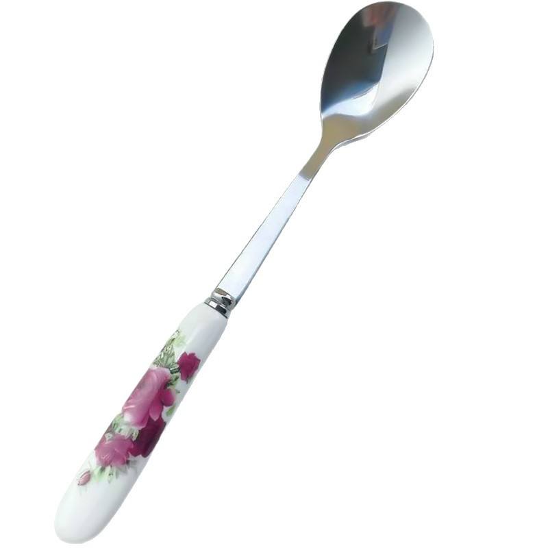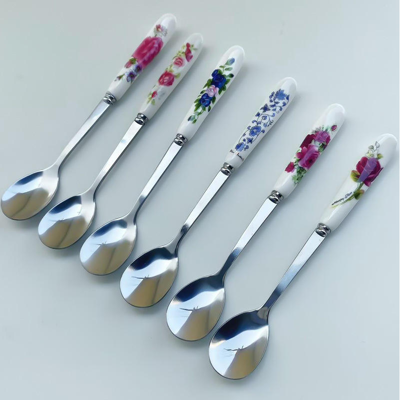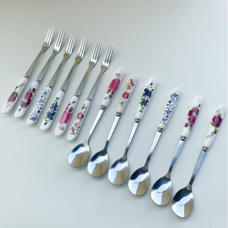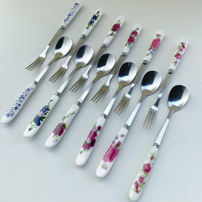 ช้อนและส้อมด้ามเซรามิกสแตนเลส ลายดอกไม้ สำหรับของหวาน ใช้ในงานเลี้ยงช่วงเวลาจิบน้ำชา