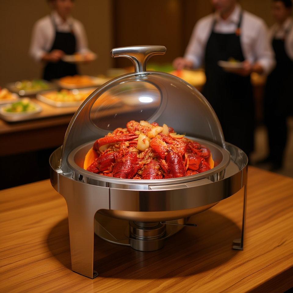 ถาดอุ่นอาหารสแตนเลสทรงกลม 6 ลิตร ฝาปิดแบบม้วนกระจก สำหรับงานจัดเลี้ยง โรงแรม ร้านอาหาร และใช้ในบ้าน