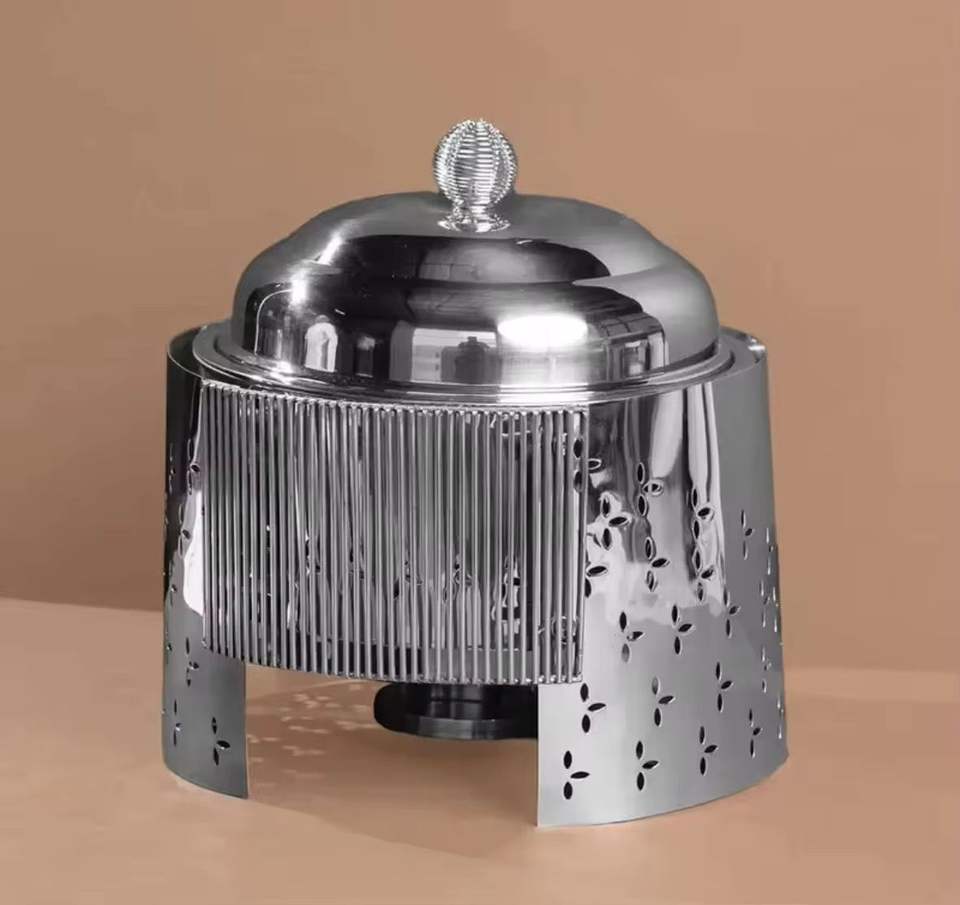 ถาดอุ่นอาหารสแตนเลสพร้อมขาตั้งตกแต่ง ฝาปิดสำหรับบุฟเฟ่ต์ อุปกรณ์เสิร์ฟอาหารสำหรับโรงแรมและร้านอาหาร