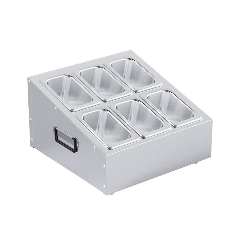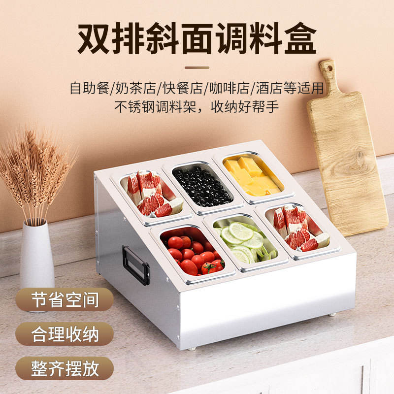 กล่องใส่เครื่องปรุงสแตนเลส 6 ช่อง ดีไซน์เอียง สำหรับบริการอาหารในโรงแรม พร้อมฝาและหูหิ้ว