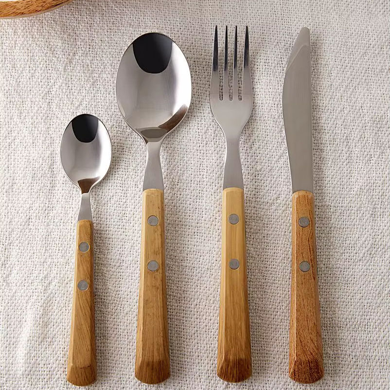 ชุดช้อนส้อมสแตนเลสพร้อมด้ามไม้ ดีไซน์หรูหรา ทนทาน เหมาะสำหรับบ้านสมัยใหม่ ร้านอาหาร คาเฟ่ งานจัดเลี้ยง งานปาร์ตี้