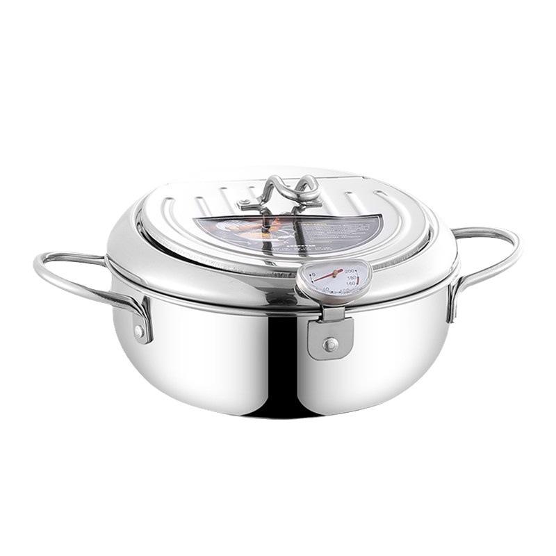 หม้อทอดสแตนเลสขนาด 20 ซม. 24 ซม. 28 ซม. พร้อมฝาปิด ควบคุมอุณหภูมิ สำหรับทอดอาหารเสียบไม้และเทมปุระ ใช้แก๊ส