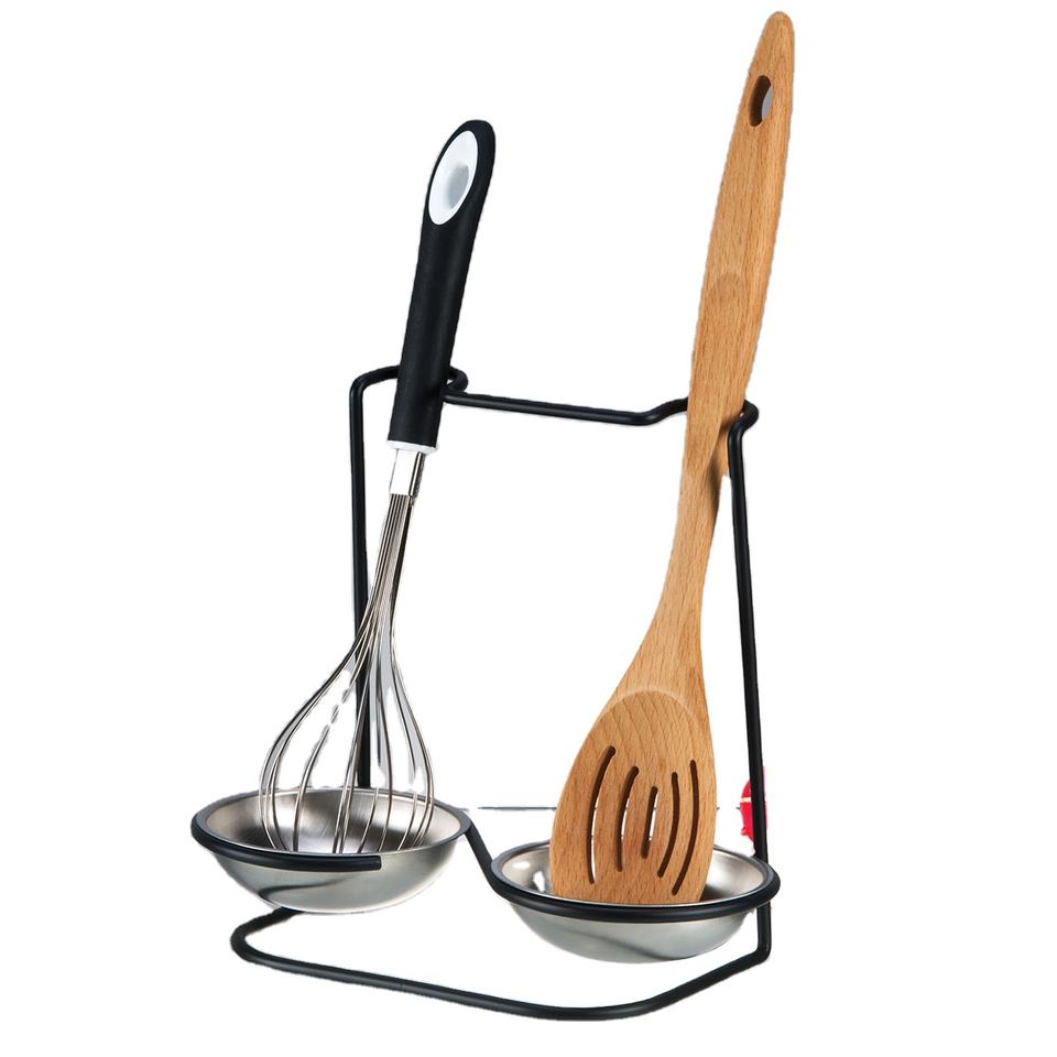 ส่วนที่เหลือช้อนสแตนเลสคู่ โครงโลหะสีดํามีช่องว่างสําหรับเครื่องมือที่วางส่วนที่เหลือเมื่ออุปกรณ์ครัวตั้งตรง