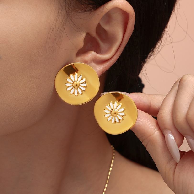 ต่างหูสแตนเลสทรงกลมสีขาวลายดอกเดซี่