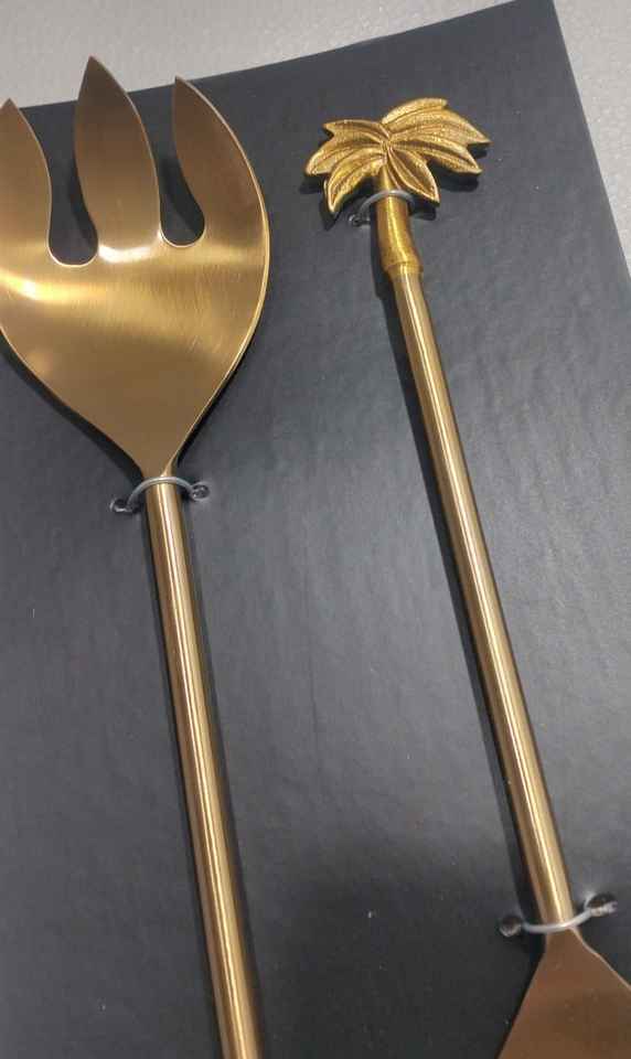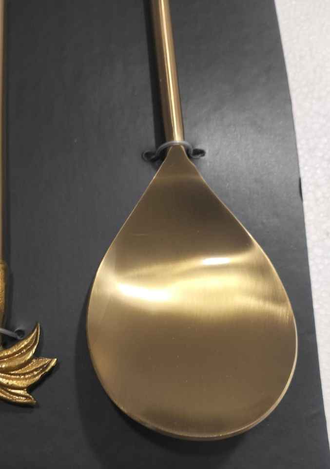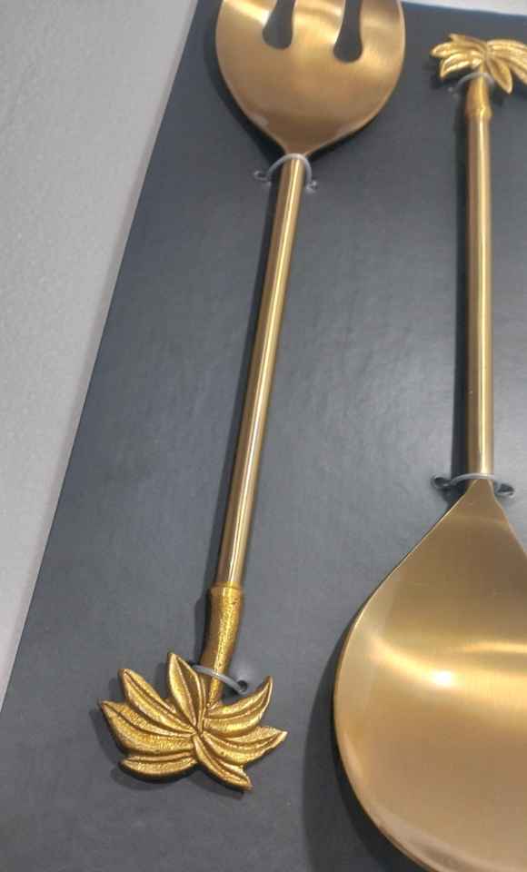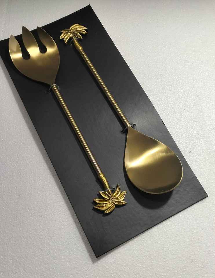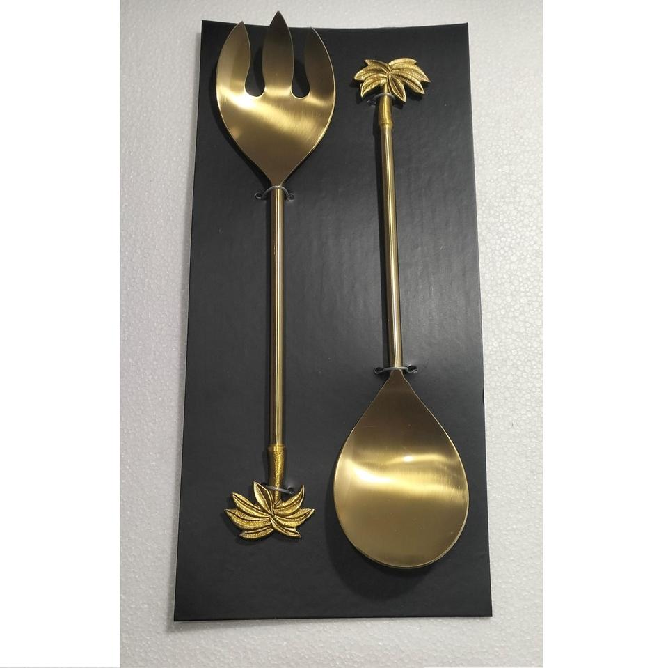 ชุดอุปกรณ์เสิร์ฟสลัดสแตนเลสสตีลรักษ์โลก 2 ชิ้น พร้อมด้ามจับลายใบไม้เคลือบทองเหลืองโบราณ