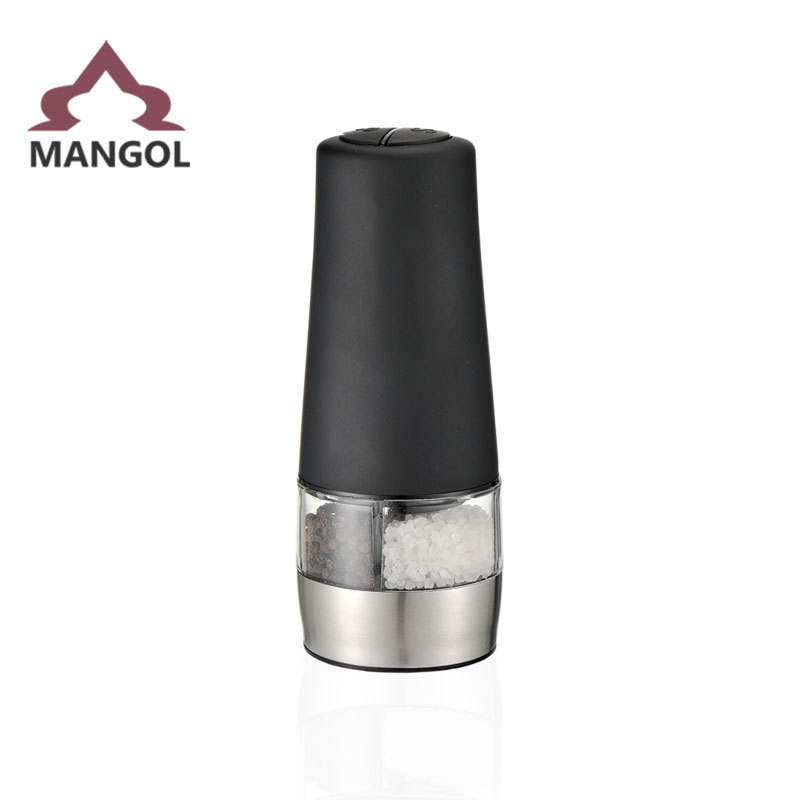 เครื่องบดพริกไทยไฟฟ้าสแตนเลสทรงกระบอกพร้อมตัวเครื่องโปร่งใสและฝาพลาสติกสำหรับใช้ในครัว