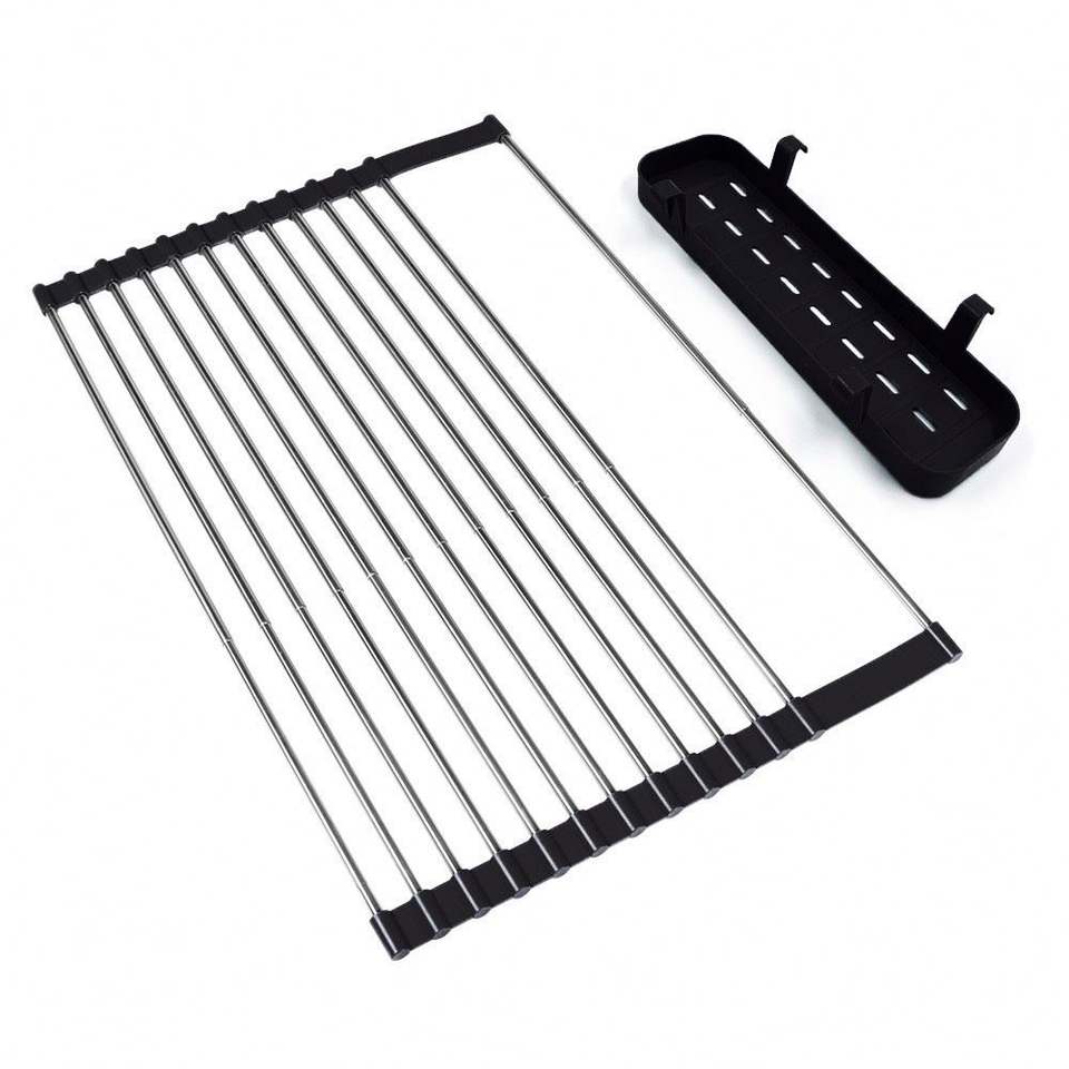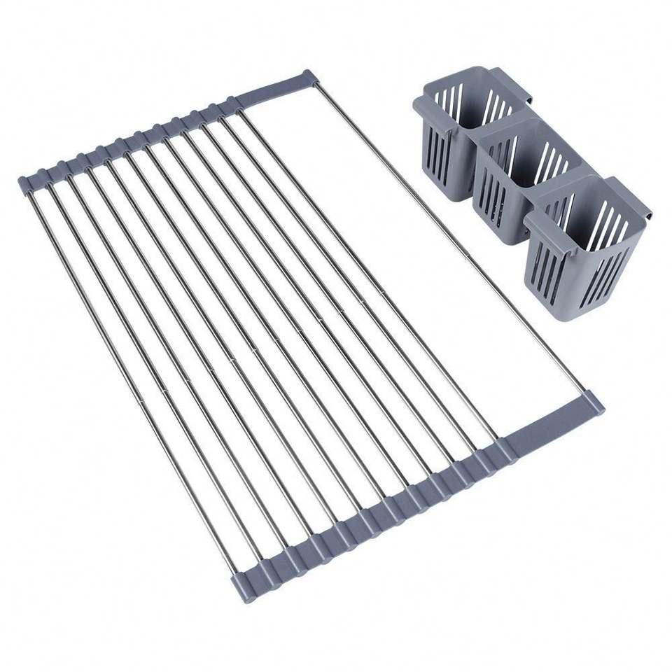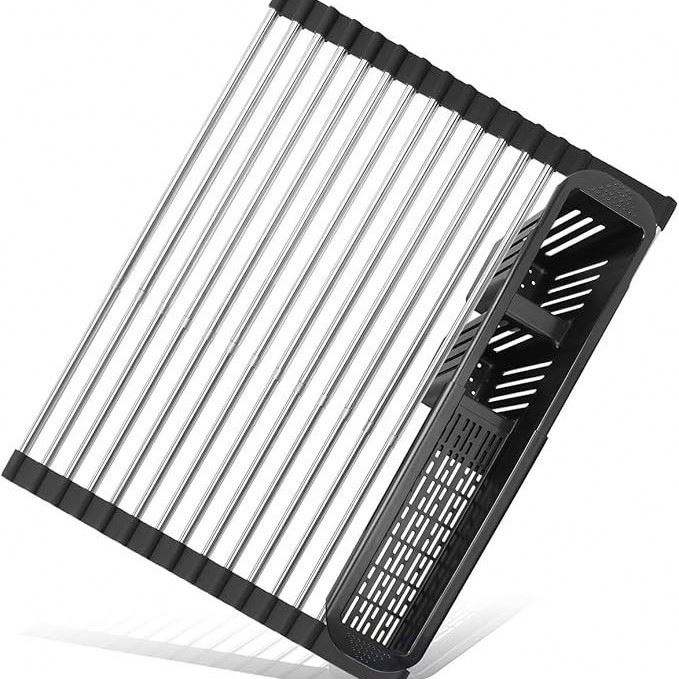 ชั้นวางจานสแตนเลสแบบขยายได้ วางเหนืออ่างล้างจาน พร้อมที่เก็บจานและชั้นวาง