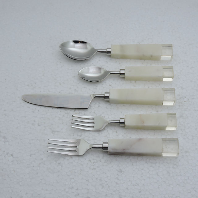 ชุดช้อนส้อมสแตนเลสสตีลสไตล์ยุโรปด้ามเรซิ่นสีขาวและสแตนเลสพร้อมชุดส้อมชุบเงิน 5 ชิ้น