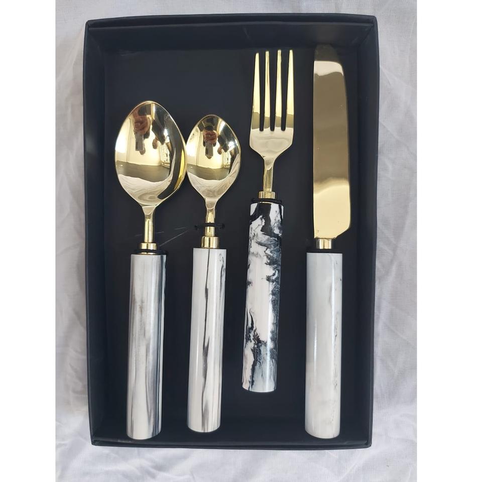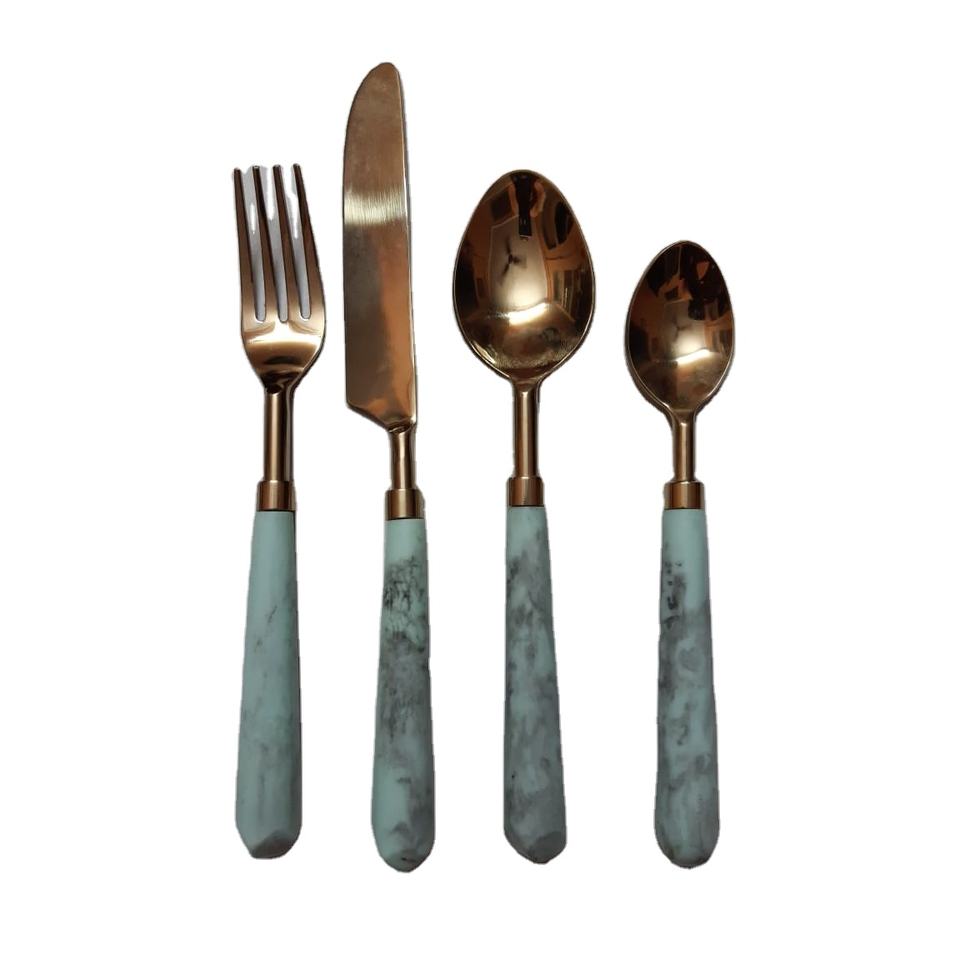 ชุดเครื่องใช้บนโต๊ะอาหารสแตนเลส4ชิ้นพร้อมที่จับเรซินชุดช้อนส้อมพร้อมแผ่นทองคำ PVD สำหรับบ้านในราคาที่เหมาะสม