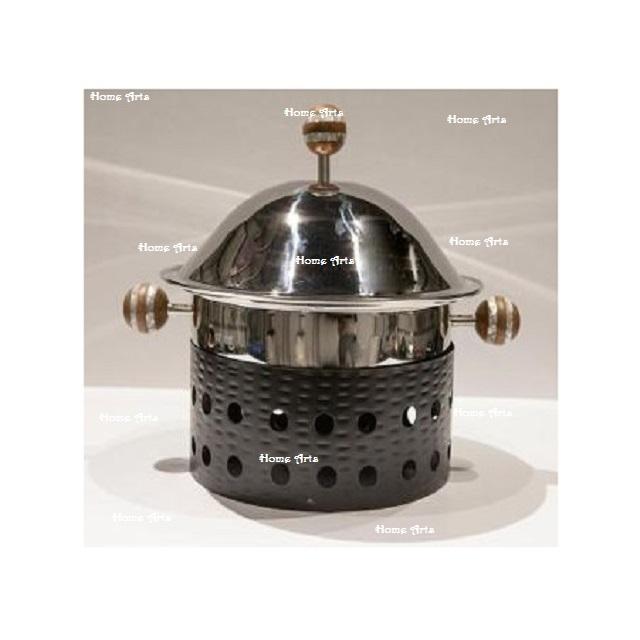จานเสิร์ฟอาหารสแตนเลสพร้อมขาตั้งเหล็กขนาดกลางทรงกลมที่อุ่นอาหารโดยใช้ศิลปะในบ้าน