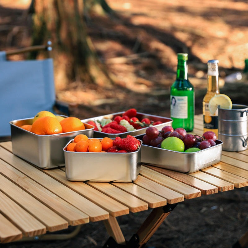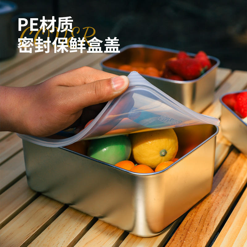 ภาชนะเก็บอาหารสแตนเลสทรงสี่เหลี่ยมวางซ้อนกันได้สำหรับการตั้งแคมป์ปิกนิกการเก็บรักษาความสดใหม่ใช้ในตู้เย็น