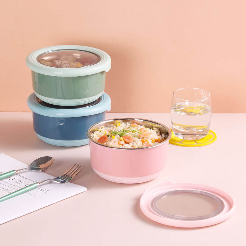 กล่องเก็บอาหารสแตนเลสทรงกลมพร้อมฝาปิดสีชมพูสีเขียวสีฟ้ากล่องอาหารกลางวันเบนโตะสำหรับผลไม้และเตรียมอาหาร