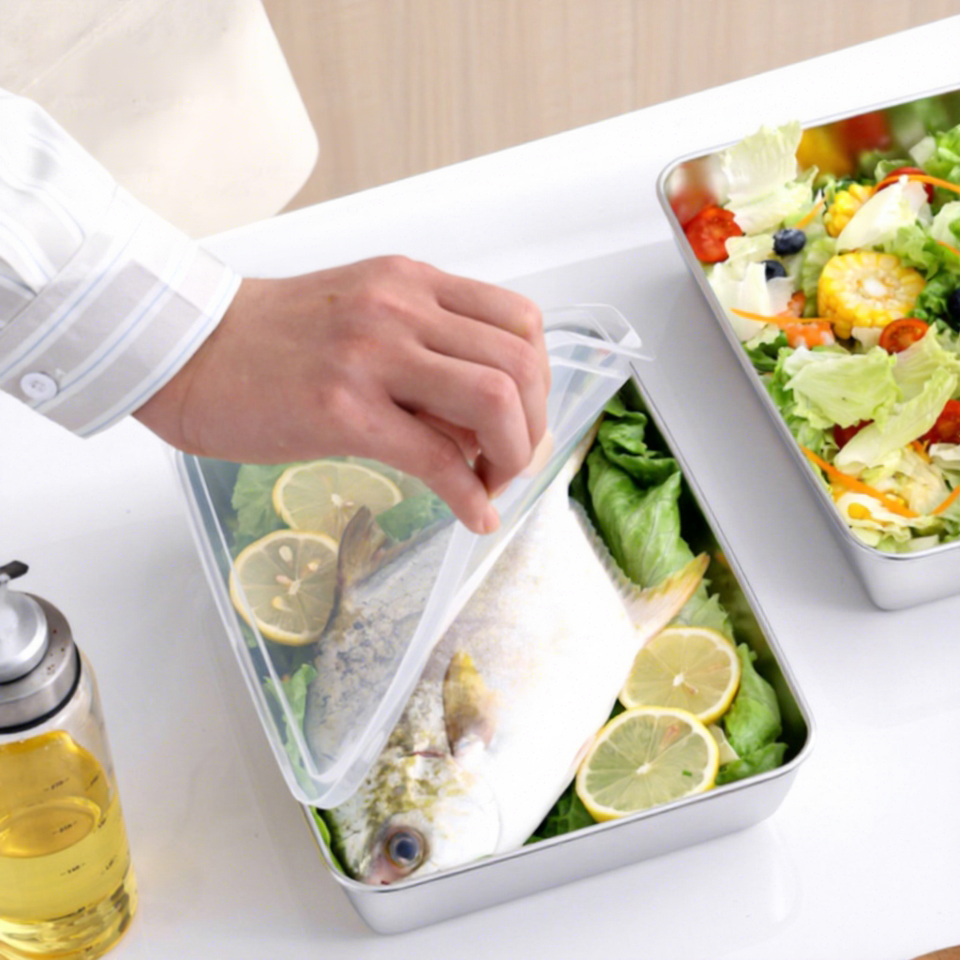 ถาดอาหารสแตนเลสทรงสี่เหลี่ยมพร้อมฝาปิดแบบพลิกหนาขึ้นสำหรับการจัดเก็บและการเตรียมอาหาร