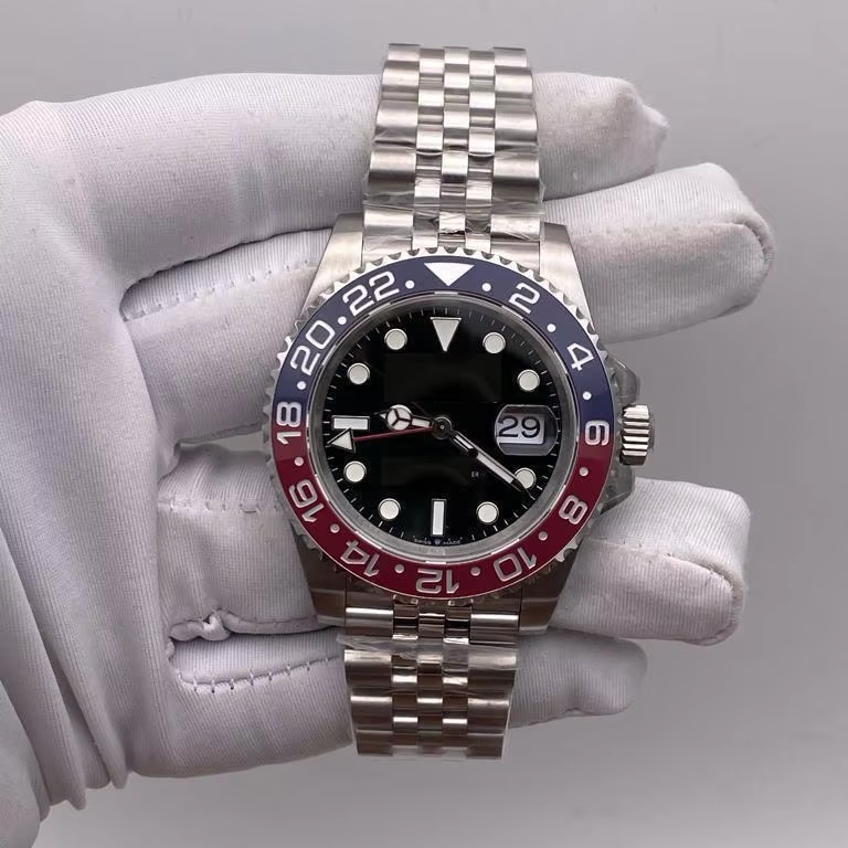 นาฬิกาข้อมือสแตนเลสสตีล GMT ออโตเมติกสุดหรู สไตล์ฮิปฮอป หน้าปัดสีดำ ขอบตัวเรือนสีแดงน้ำเงิน 24 ชั่วโมง สายจูบิลี่ พร้อมกลไก ETA