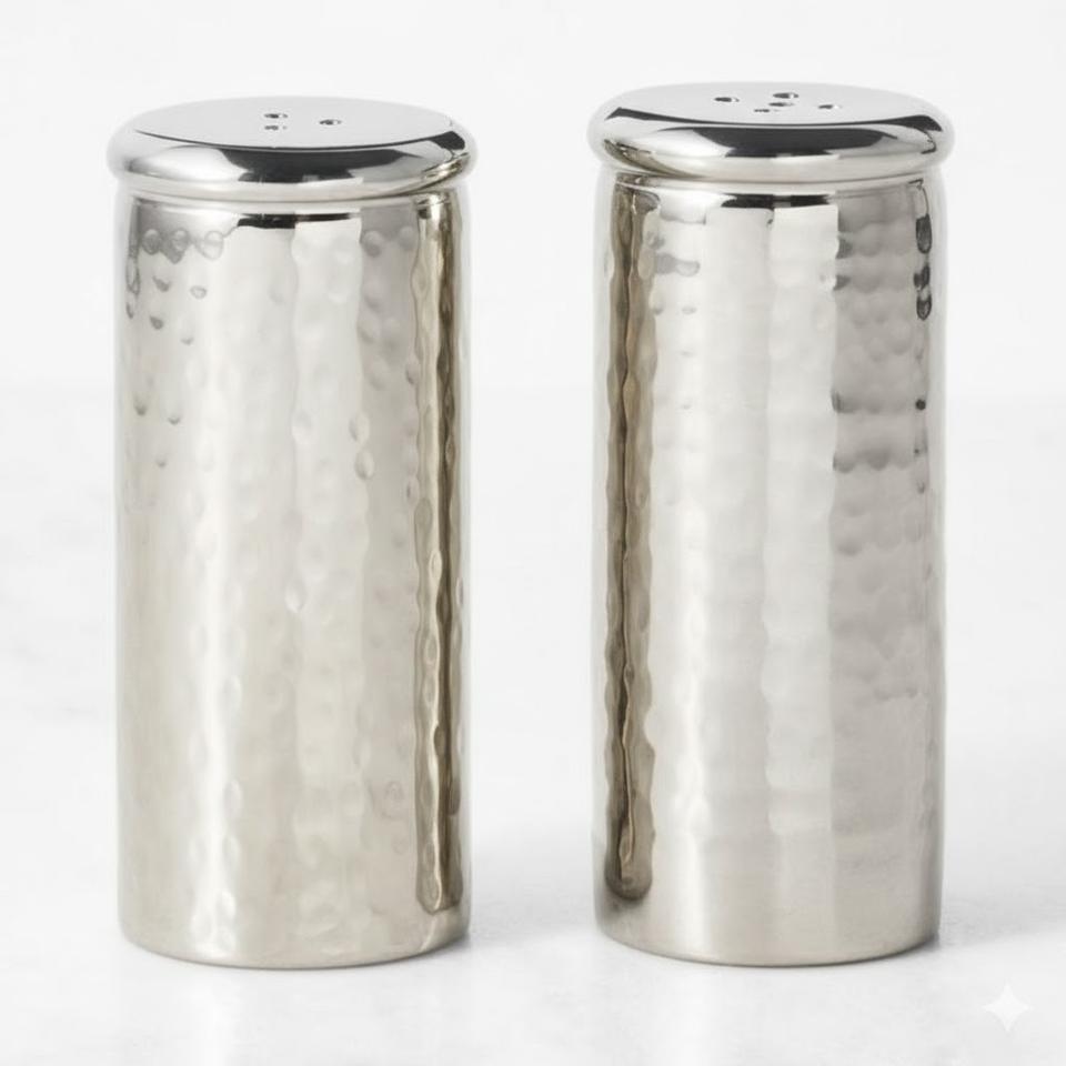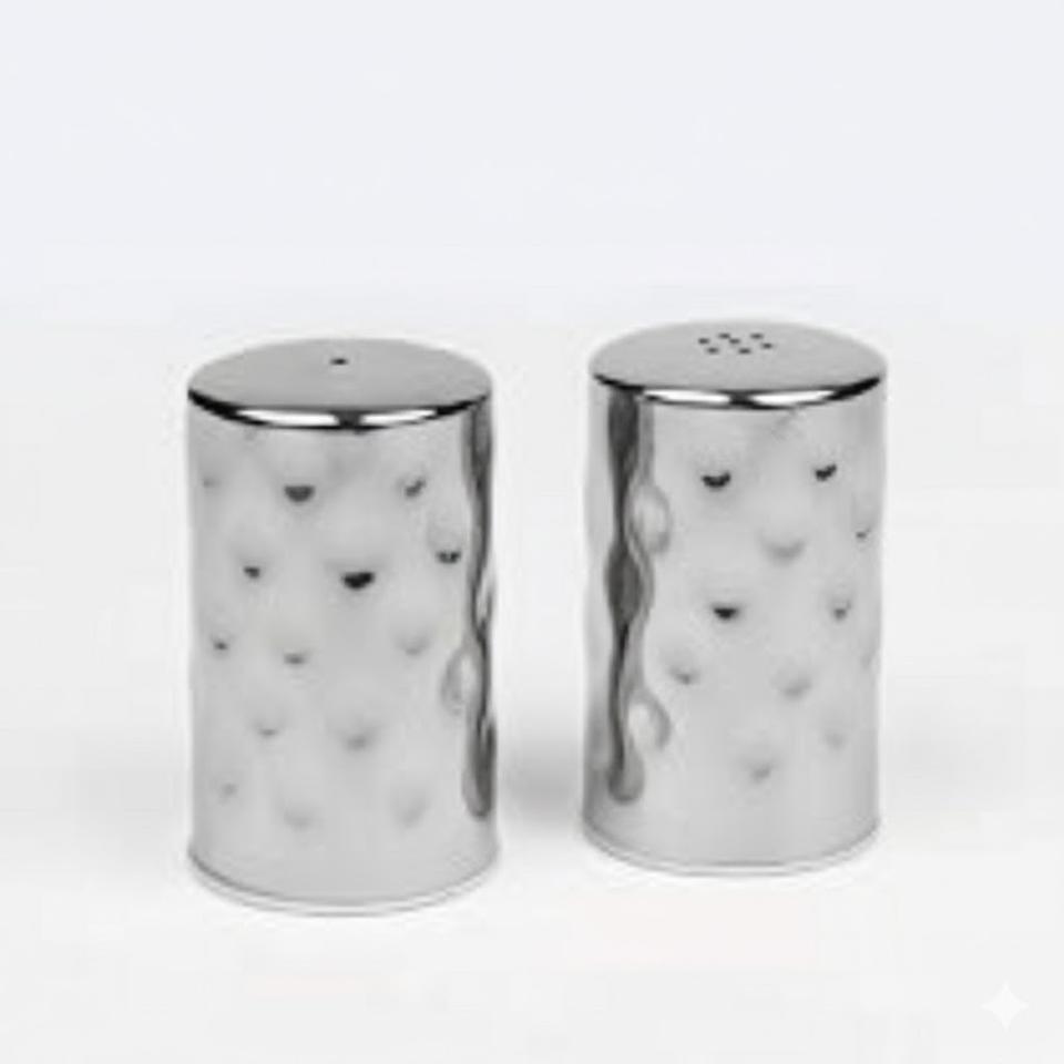กระปุกใส่เกลือและพริกไทยสแตนเลสแบบตอกลาย ดีไซน์หรูหราทันสมัย สำหรับครัวและร้านอาหาร ภาชนะใส่เครื่องเทศสำหรับวางบนโต๊ะ สีเงิน