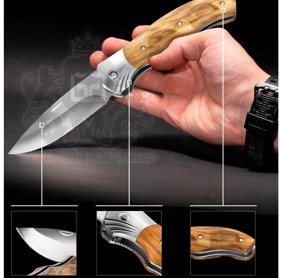 มีดพับสแตนเลสแบบกำหนดเองขายดีที่สุด ด้ามไม้ ทรงตรง แข็งแรง ทนทาน สำหรับกิจกรรมกลางแจ้ง แคมป์ปิ้ง EDC แบบกดปุ่ม ปลายใบมีดแบบดรอปพอยต์