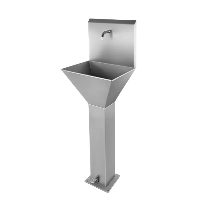 สถานีล้างมือสแตนเลส 304L พร้อมเครื่องผสมแบบเท้าเหยียบ อุปกรณ์สุขอนามัย