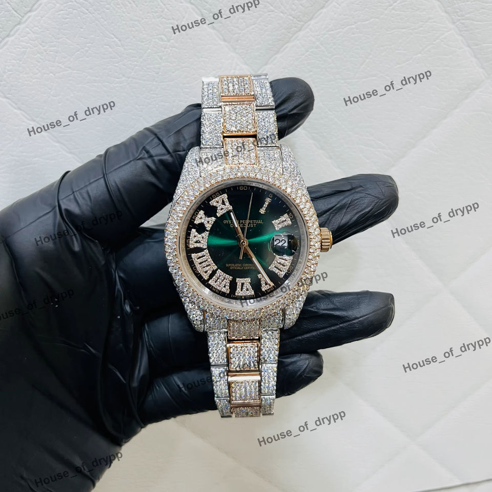 Stainless Steel Iced Lab Grown Diamond Roman Numerals Date Bustdown Watch Green Dial Unisex Elegant Hip-Hop Luxury Wrist Watch
