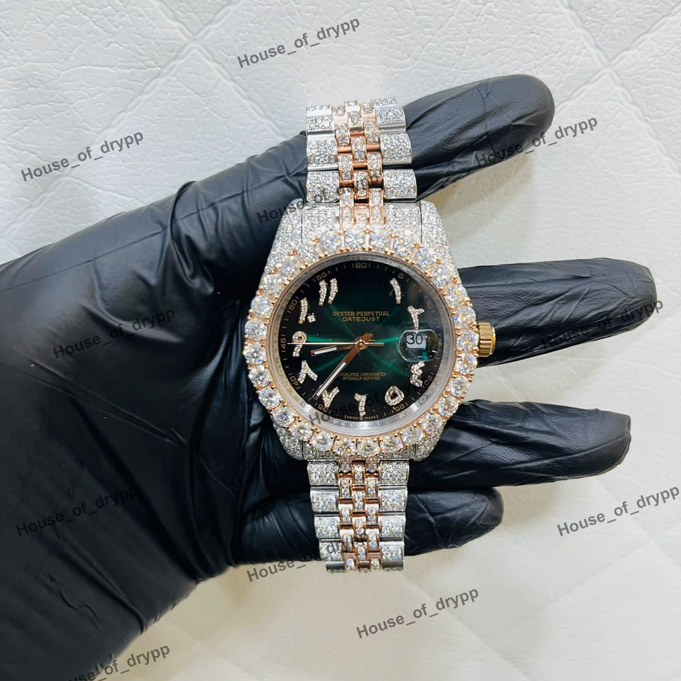 นาฬิกาข้อมือฮิปฮอปดีไซน์หรูหราประดับเพชรแล็บโกรว์ ตัวเรือนสีเขียว หน้าปัดตัวเลขอารบิก สายสแตนเลสสตีล
