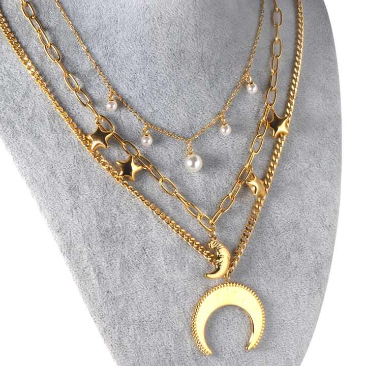 สร้อยคอจี้สแตนเลสสตีลชุบทอง 18K ลายดวงจันทร์และดวงดาว ประดับมุก สร้อยคอแบบหนาสำหรับผู้หญิง