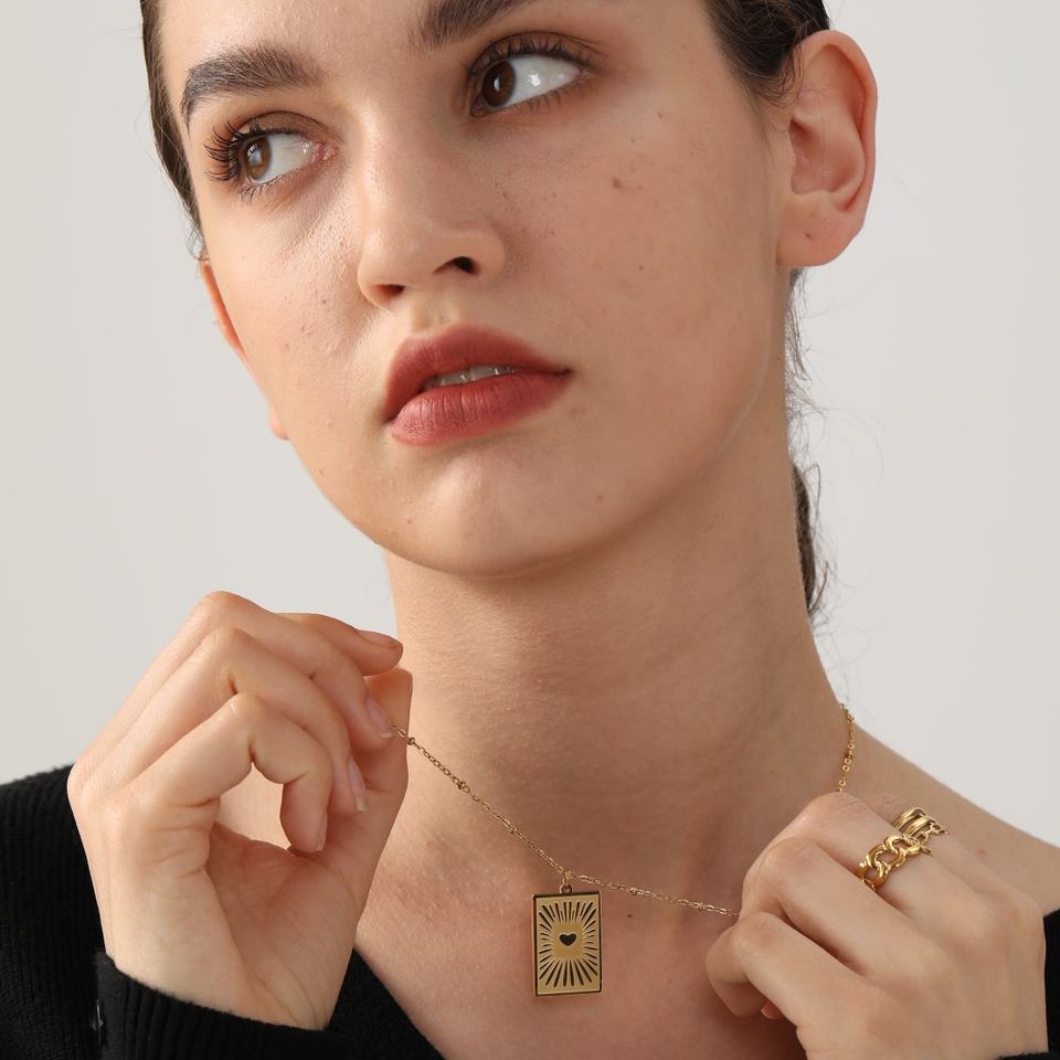 สร้อยคอจี้สี่เหลี่ยมชุบทอง 18K สแตนเลสสตีล สลักลาย โซ่เส้นเล็ก สร้อยคอเรียบง่ายสำหรับทุกเพศ