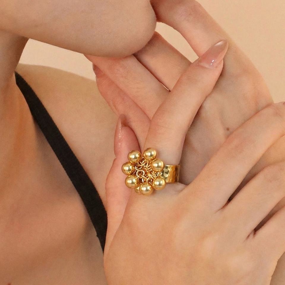 ชุดแหวนสแตนเลสสตีลชุบทอง 18K ดีไซน์หนา แหวนโดมลายเม็ดบีดแบบเปิด แหวนมินิมอลเรียบหรูสำหรับผู้หญิง