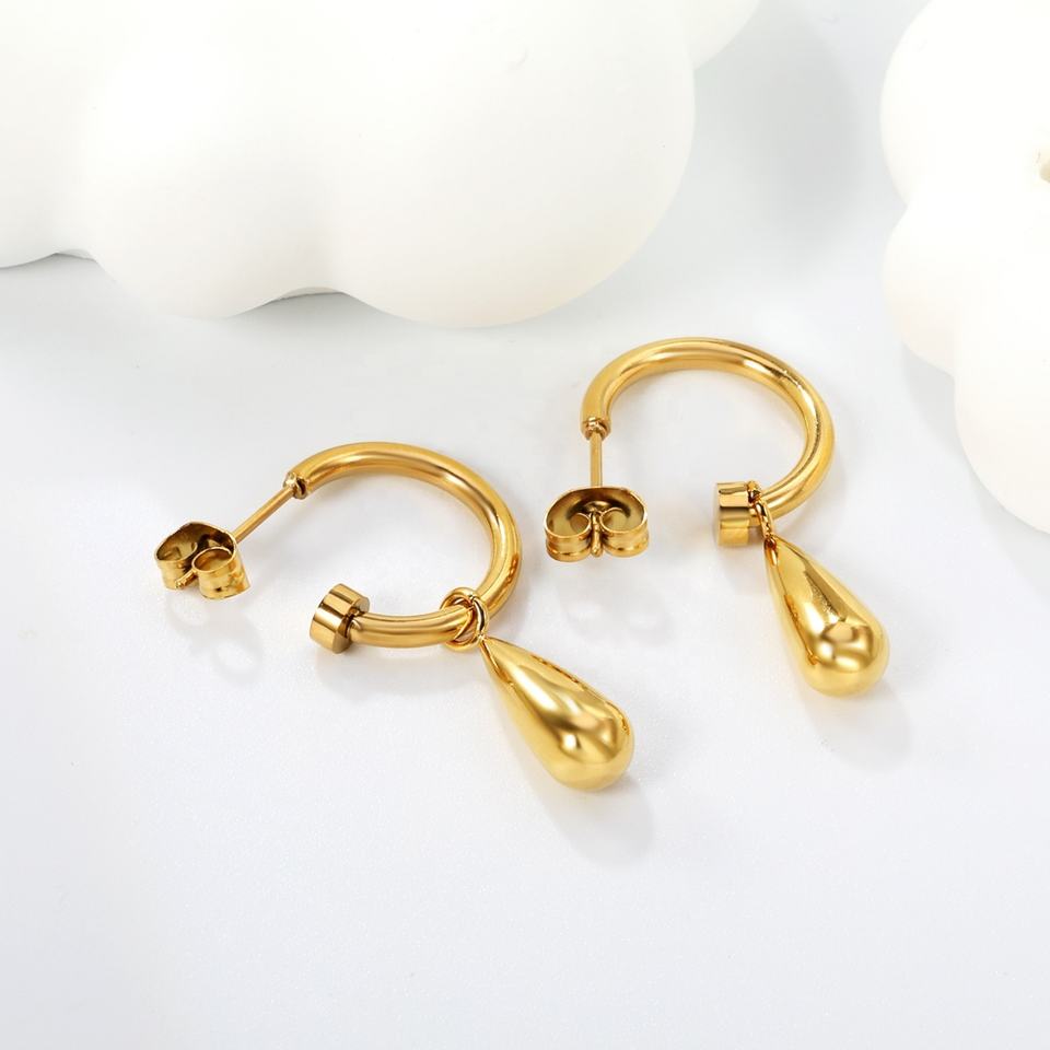 ต่างหูห่วงชุบทองประดับคริสตัลเพทายรูปทรงสี่เหลี่ยมจัตุรัสประดับดาวและหยดน้ำ พร้อมจี้ห้อยทำจากสแตนเลสสตีล