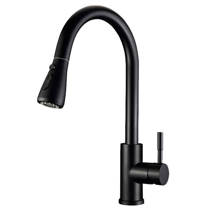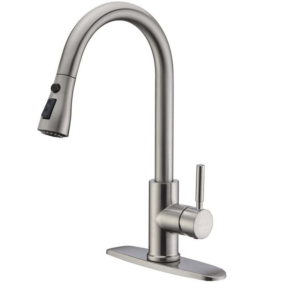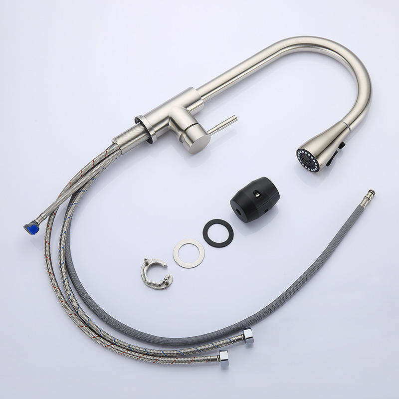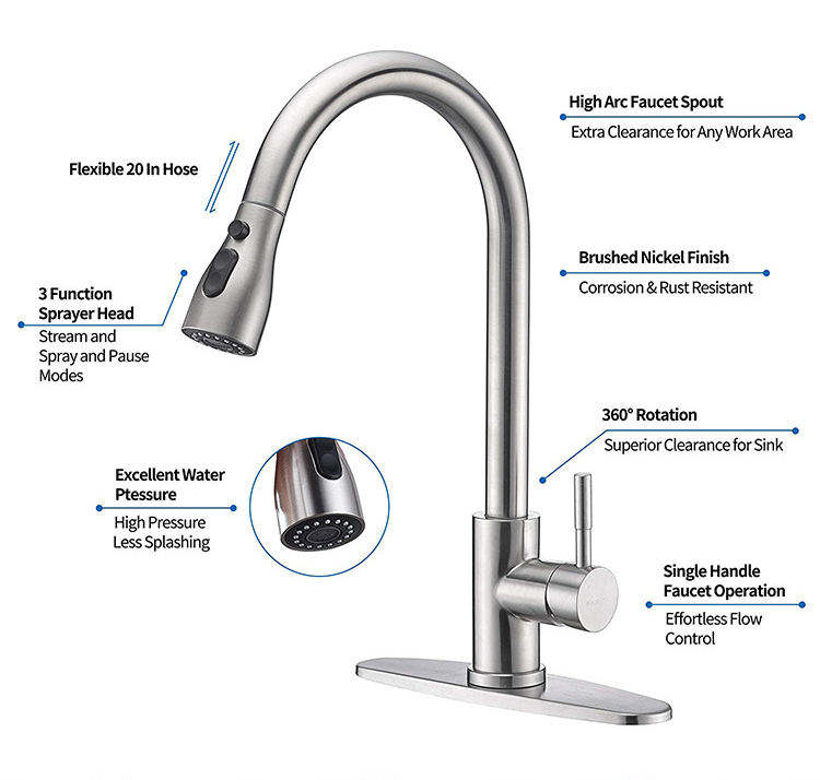 ก๊อกน้ำห้องครัวสแตนเลสแบบดึงออกได้ พร้อมหัวฉีดเซรามิก ผิวสัมผัสแบบนิกเกิลขัดเงา ดีไซน์โค้งสูง สำหรับใช้ในบ้านและเชิงพาณิชย์