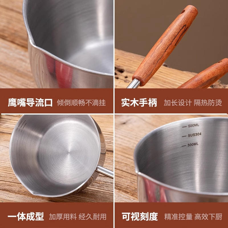 หม้อน้ำมันสแตนเลสด้ามยาวพร้อมด้ามไม้ 300 มล. สำหรับทำอาหารในครัวและอุ่นนม