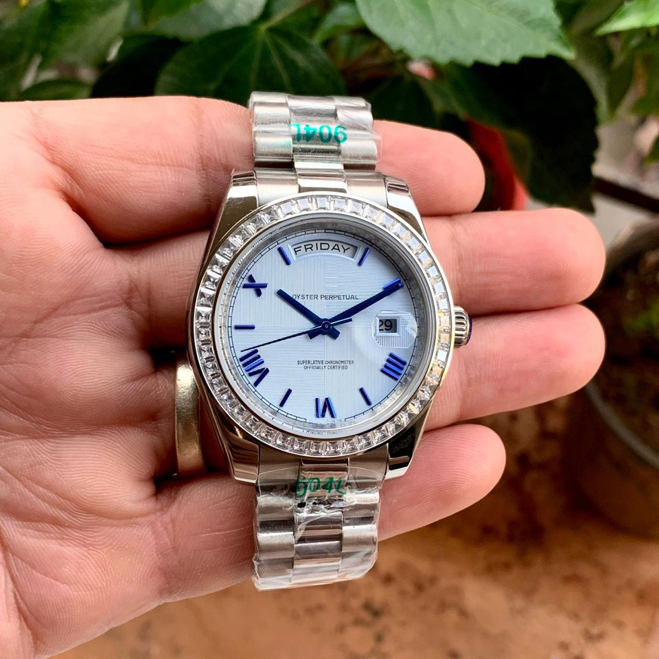 นาฬิกาข้อมือจักรกลสแตนเลสสตีลหรูหรา หน้าปัดสีฟ้าใส ตัวเลขโรมันสีน้ำเงิน ขอบตัวเรือนประดับเพชร ตัวล็อคแบบซ่อน สไตล์ฮิปฮอป