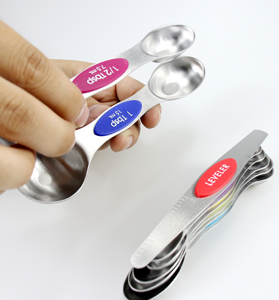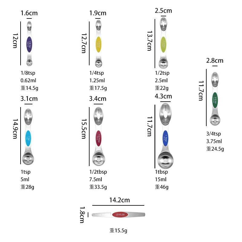 ช้อนตวงสแตนเลสแบบแม่เหล็กสองหัว ชุด 8 ชิ้น เกรดอาหาร สำหรับทำขนมและตวงเครื่องปรุง