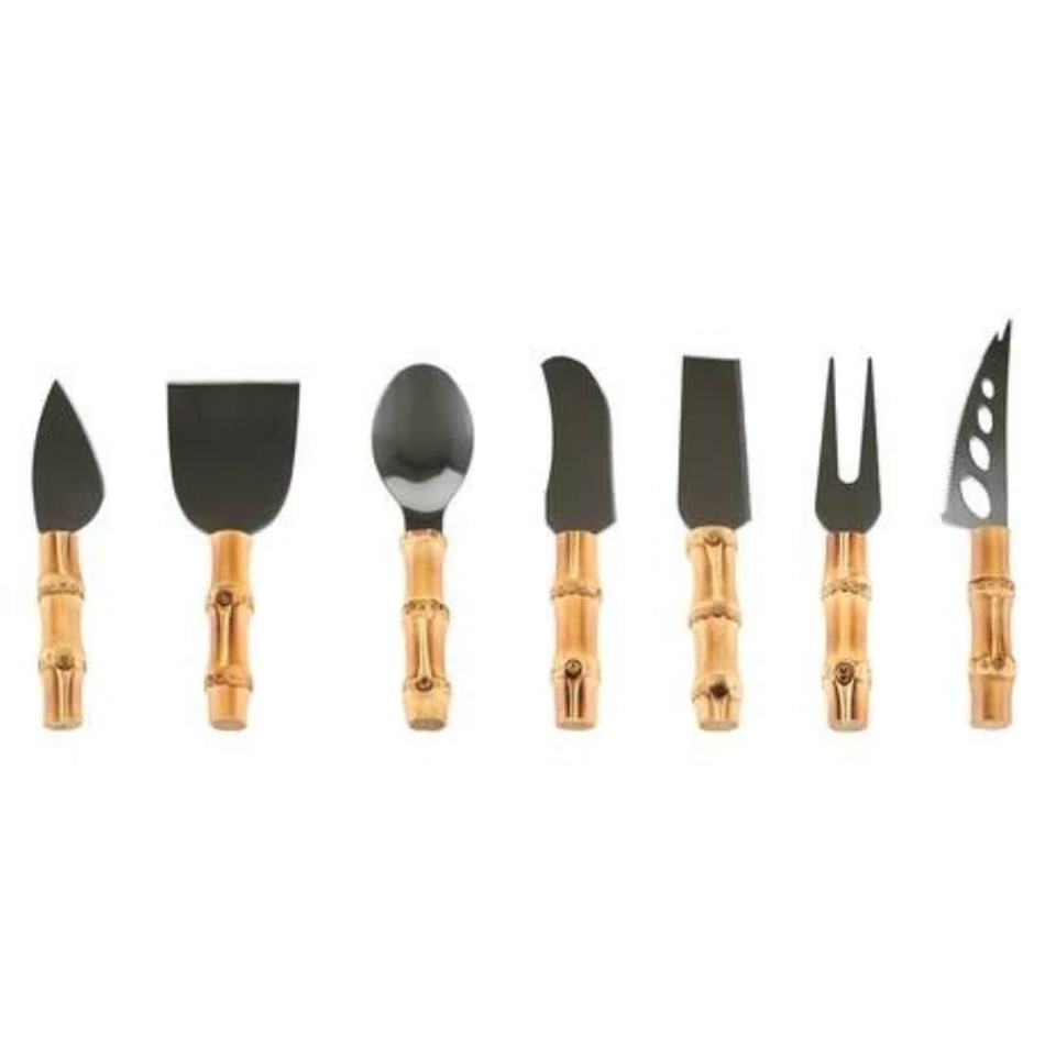 ชุดเครื่องมือทำชีสสแตนเลส7ชิ้นแบบทันสมัยพร้อมกระจกขัดเงาด้ามไม้ไผ่สำหรับเสิร์ฟ