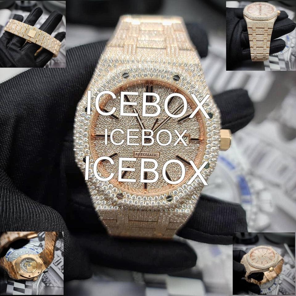 นาฬิกาข้อมือตัวเรือนสแตนเลสและโมอิสซาไนต์ หน้าปัดกระจก ประดับเพชรโมอิสซาไนต์เต็มหน้าปัด กันน้ำได้ 10 บาร์ สายแบบมีตัวล็อค