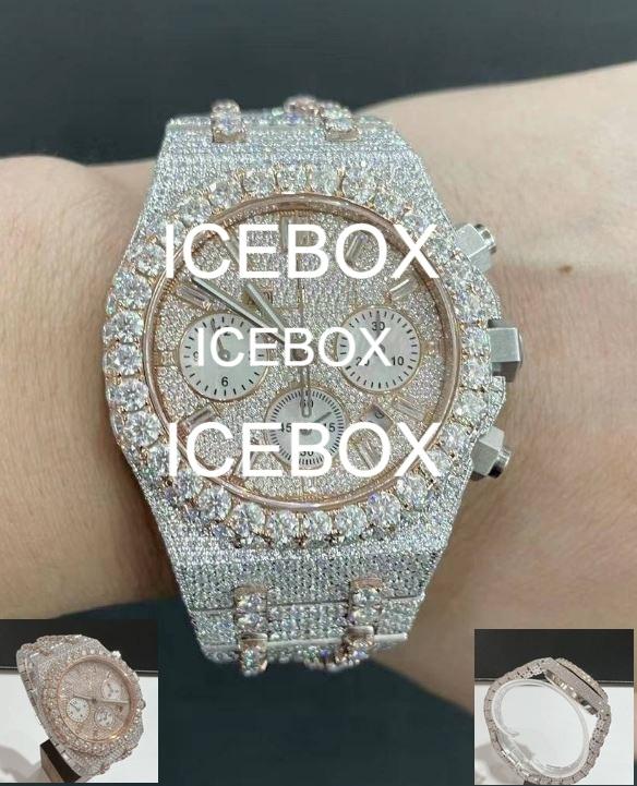 นาฬิกาข้อมือยูนิเซ็กส์ ตัวเรือนสแตนเลสสตีลและโมอิสซาไนต์ทรงกลม หน้าปัดกระจก ประดับเพชรเต็มหน้าปัด กันน้ำได้ 10 บาร์ สายแบบหัวเข็มขัด