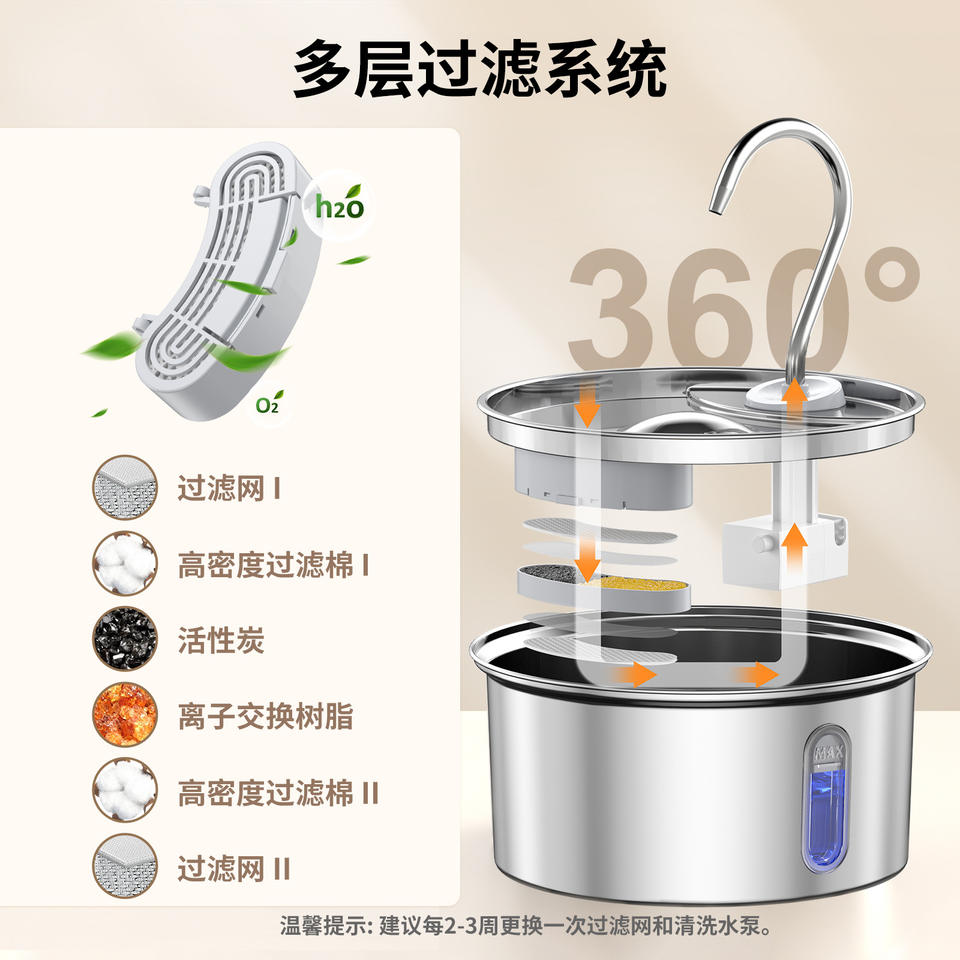 เครื่องจ่ายน้ำสัตว์เลี้ยงอัตโนมัติทรงกลมสแตนเลสพร้อมหน้าต่างระดับน้ำสำหรับสุนัขและแมว