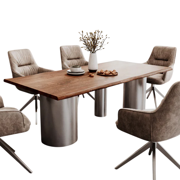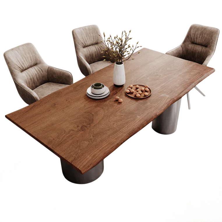 โต๊ะรับประทานอาหารสไตล์โมเดิร์นสำหรับบ้านและห้องครัว โครงฐานสแตนเลสแบบ Piler พร้อมท็อปไม้เนื้อแข็งอะคาเซียขอบโค้งธรรมชาติ ผิวเคลือบวอลนัท