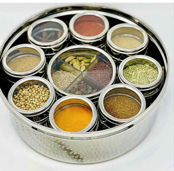 ชุดเครื่องปรุงรสสแตนเลสทรงกลม กล่องใส่เครื่องเทศสำหรับครัว พร้อมช้อนตักเครื่องเทศ กล่องใส่เครื่องเทศสแตนเลส
