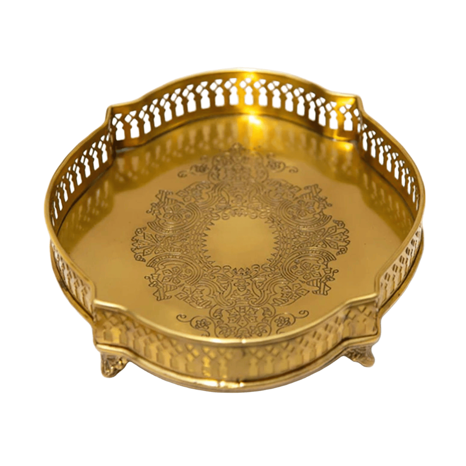 ถาดเสิร์ฟสแตนเลสขัดเงาสีเงินทรงกลมพร้อมขอบงานแบบคัตเอาท์หรูหราอุปกรณ์เสริมในการรับประทานอาหาร