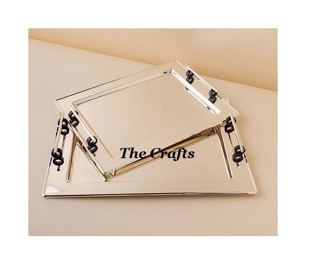 ชุดถาดเสิร์ฟสแตนเลส 2 ใบ รูปทรงต่างๆ ดีไซน์ทันสมัย ถาดใส่อาหาร/ช็อคโกแลต พร้อมหูจับลายทอง