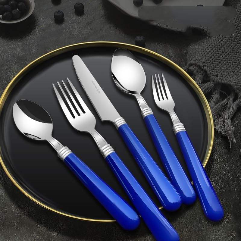 ชุดเครื่องใช้บนโต๊ะอาหาร5ชิ้นพร้อมที่จับสีเงินชุบเคลือบสีเงินสำหรับโต๊ะอาหารที่จับทรงกลมสีฟ้า