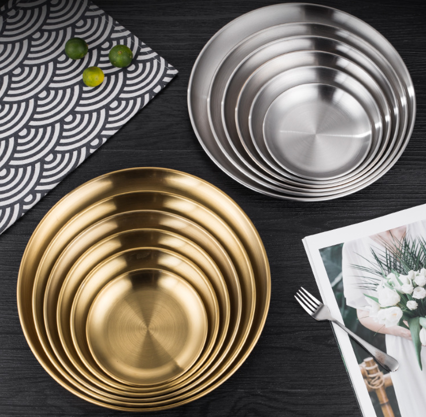 จานสแตนเลสทรงตื้น เกรดอาหาร สำหรับใช้ในบ้าน จานใส่ของหวาน จานสำหรับเคี้ยวกระดูก จานสเต็กสำหรับร้านอาหาร จานอาหารตะวันตก