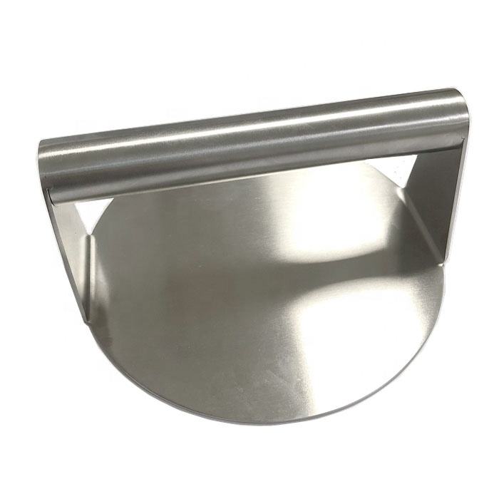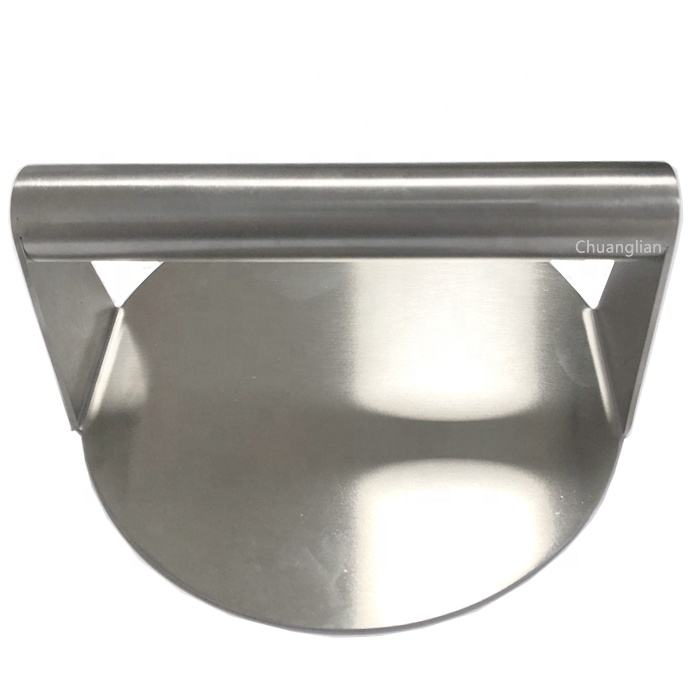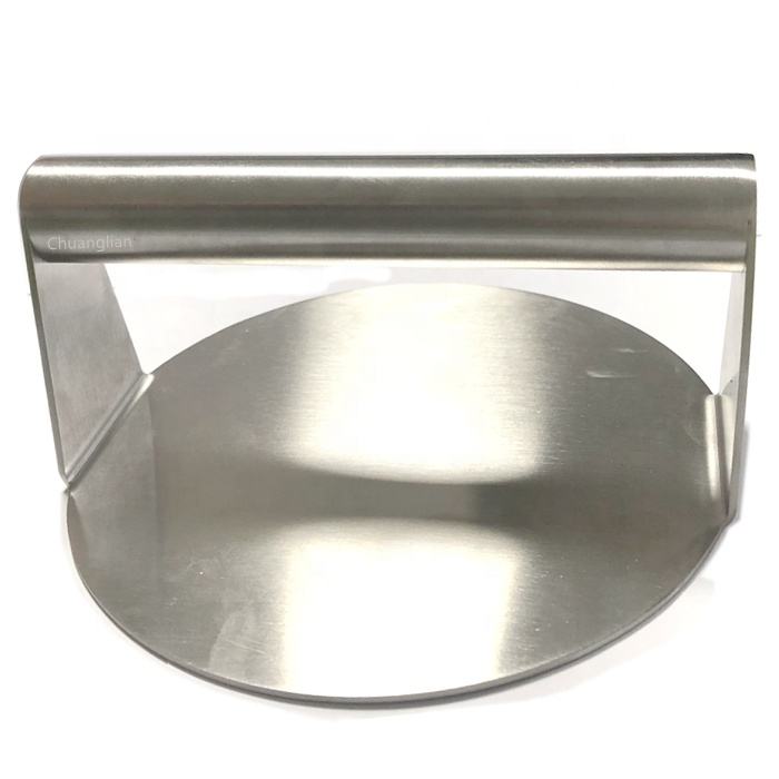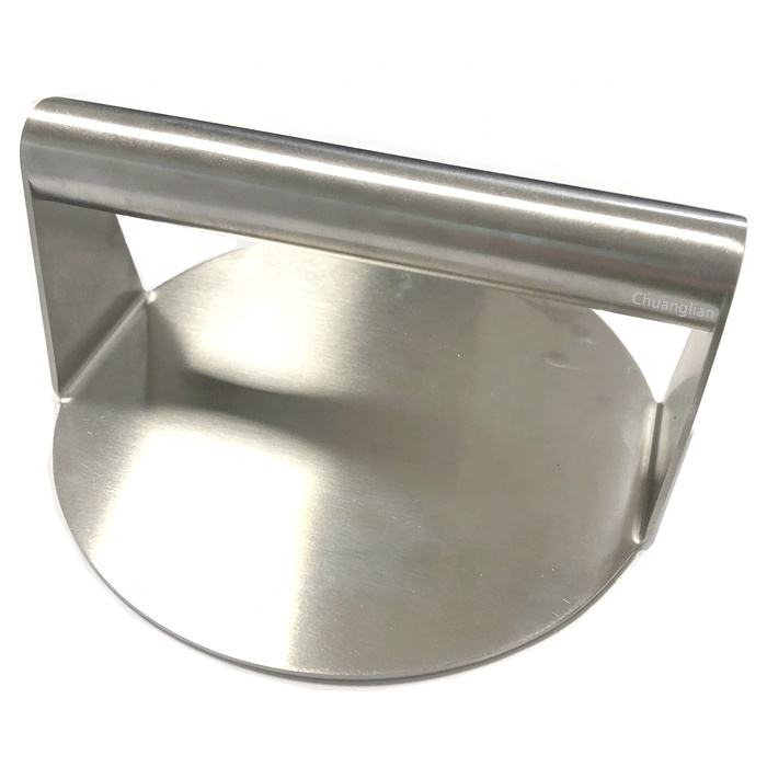 ที่กดเบอร์เกอร์สแตนเลสสีเงิน ด้ามจับโลหะ ขนาด 6.3 นิ้ว น้ำหนักเบา ทนทาน รับทำโลโก้ แบรนด์ CL สำหรับใช้ในสวน ชายหาด และตั้งแคมป์