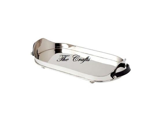 ถาดเสิร์ฟสแตนเลสสีเงินพร้อมด้ามจับหนังถาดสำหรับตกแต่ง