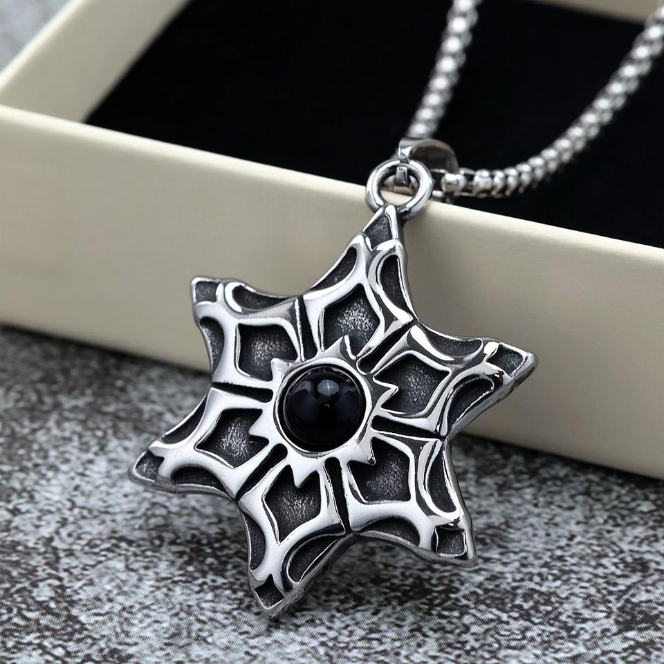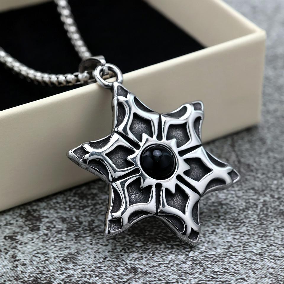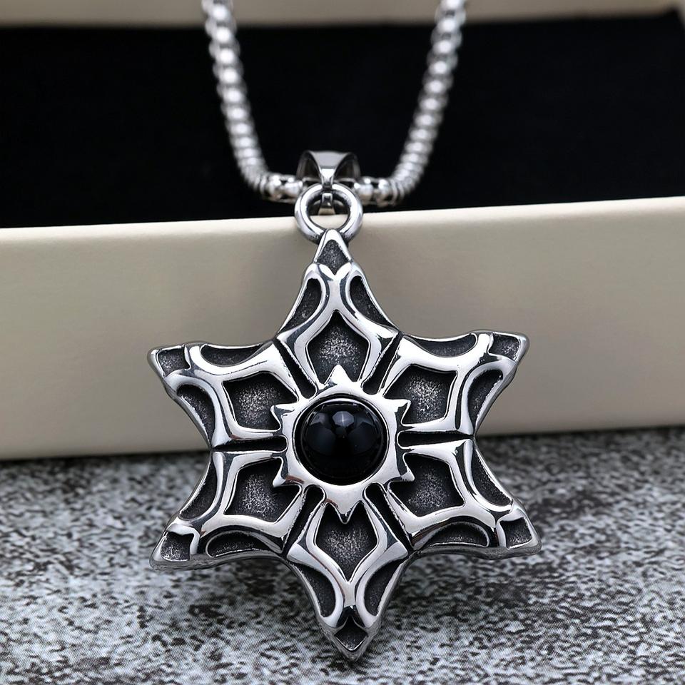 จี้ดาวหกแฉกสแตนเลสสตีลประดับพลอยสีดำสำหรับผู้ชาย สร้อยคอของขวัญ
