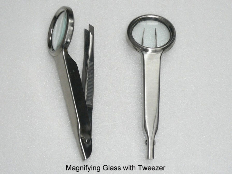 แหนบสแตนเลสปลายเฉียงพร้อมแว่นขยายสำหรับกำจัดขน เครื่องมือเสริมความงามอเนกประสงค์