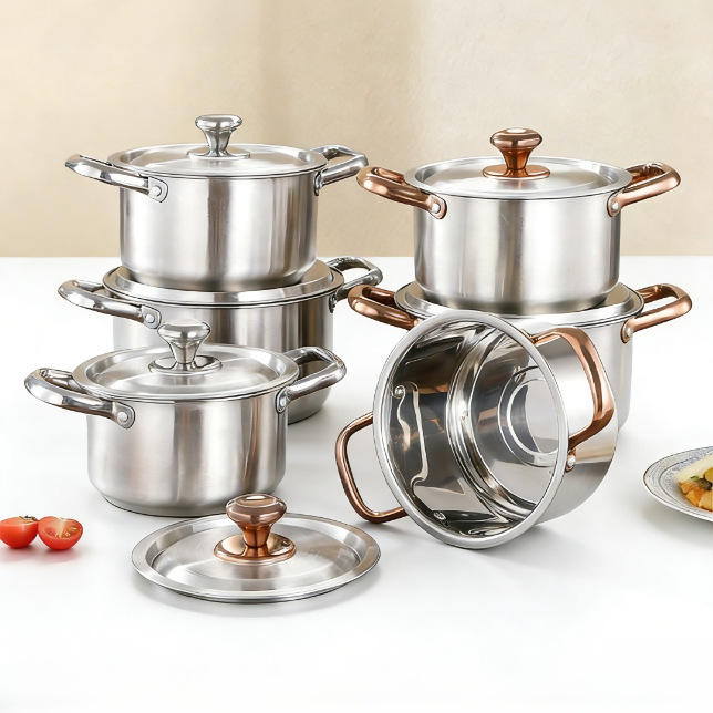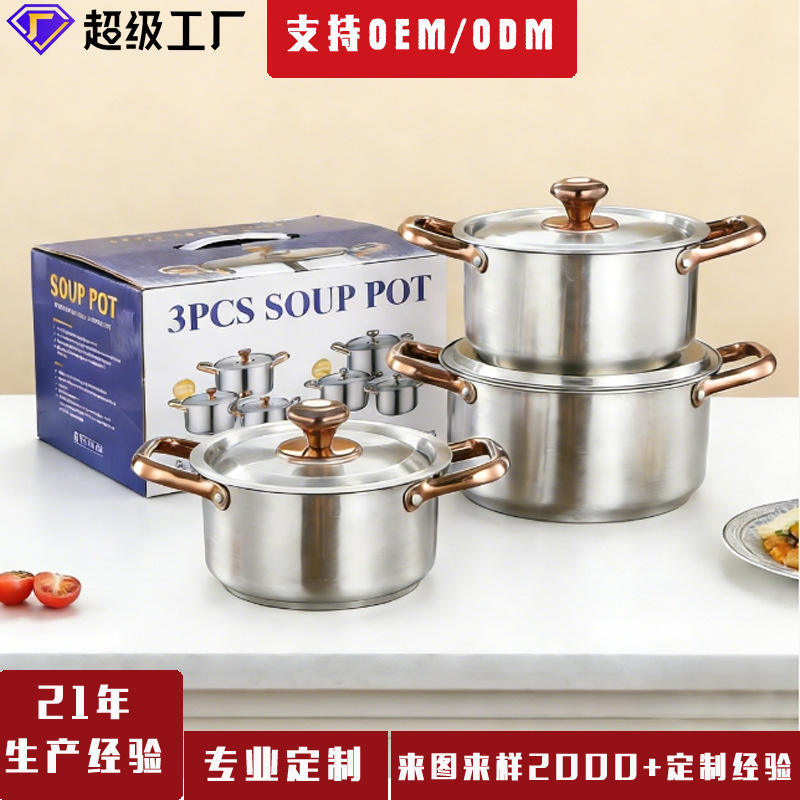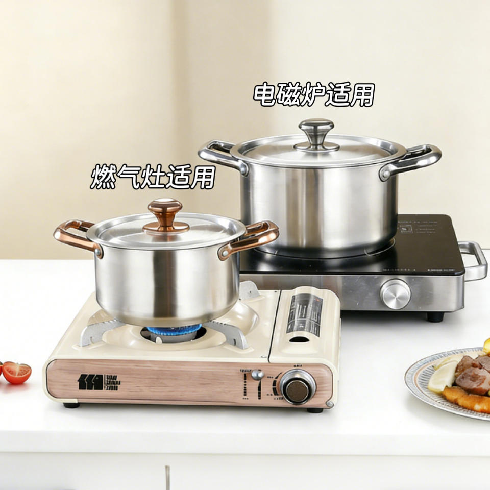 ชุดหม้อซุปสแตนเลสแบบมีหูจับสองข้าง ใช้ได้กับเตาแม่เหล็กไฟฟ้าและเตาแก๊ส