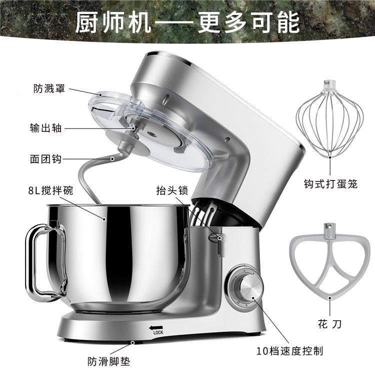 เครื่องผสมอาหารแบบตั้งโต๊ะสแตนเลส 8 ลิตร เครื่องเตรียมอาหารไฟฟ้าอเนกประสงค์ สำหรับผสมเค้ก ขนมปัง แป้งโดว์ และสลัด