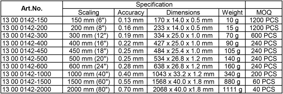 0.13 มม., 0.16 มม., 0.19 มม., 0.22 มม., 0.25 มม.