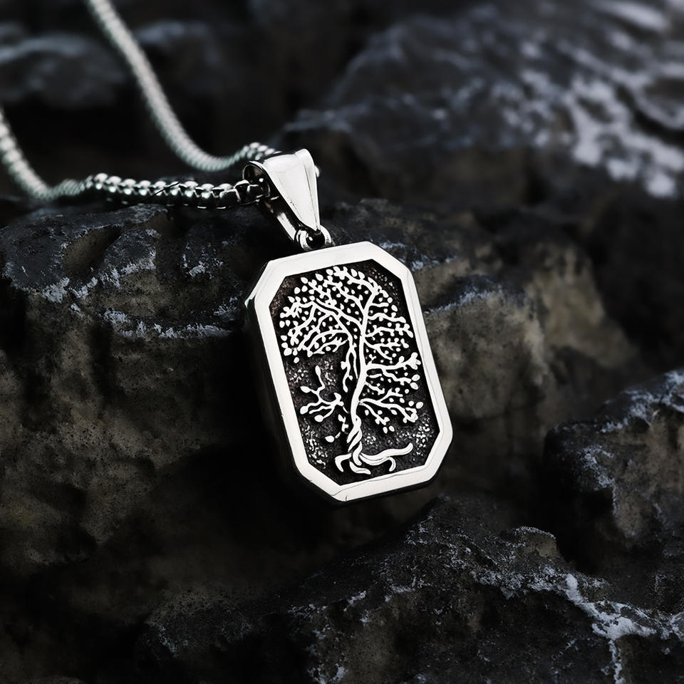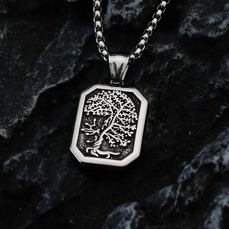 Stainless Steel Tree Of Life Pendant Necklace For Men Geometric Plant Design Single Sided Tag Jewelry