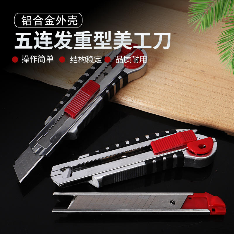 Stainless Steel Utility Knife 16.5cm Red Rubber Coated Five Shot Blade For Office And Wall Cutting
